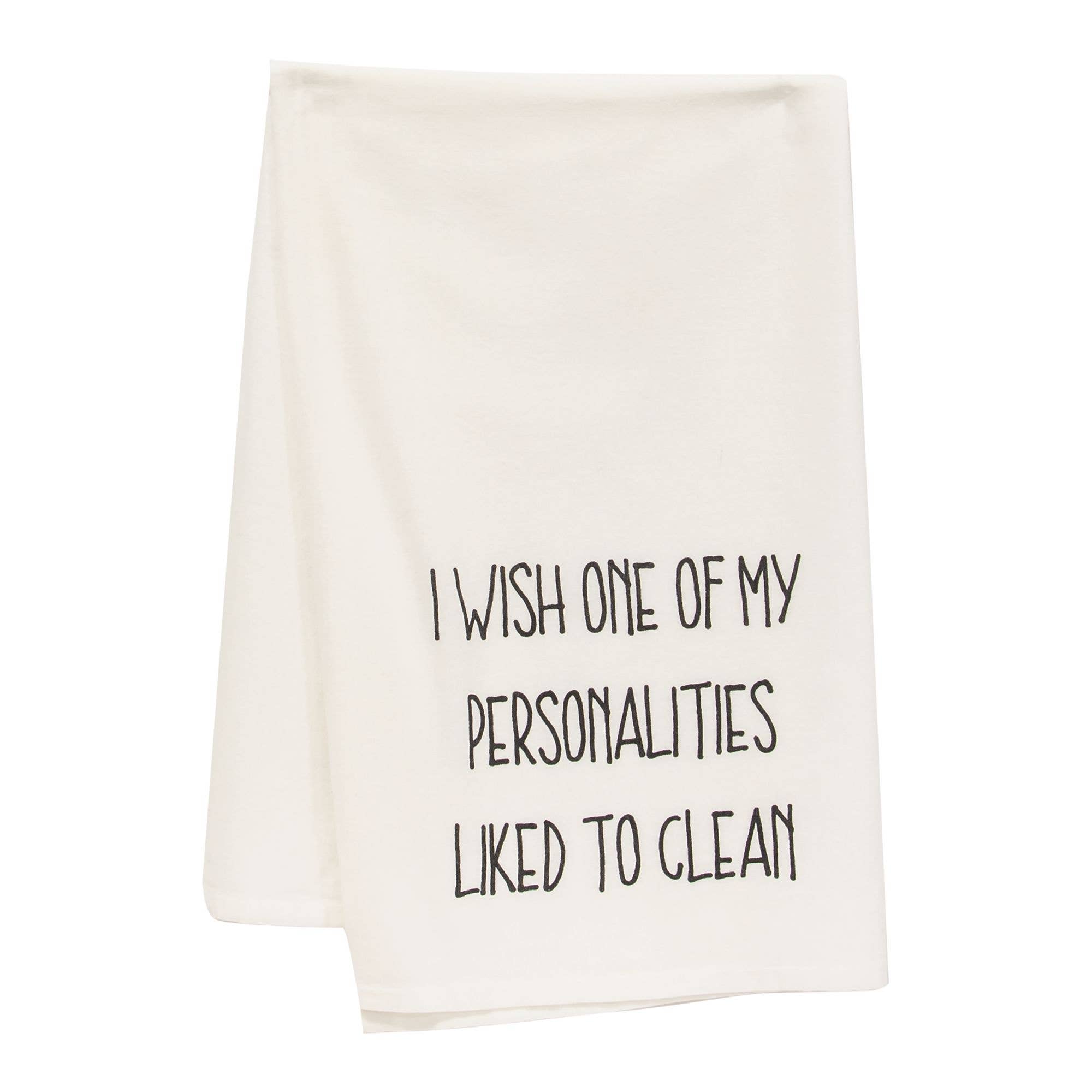 I Wish One Of My Personalities Liked To Clean Dish Towel reads, "I Wish One Of My Personalities Liked To Clean "in black text over a clean white finish. Towel is made of 100%cotton and it is machine washable for easy maintenance. Measures 28" high by 28" wide by .25" deep.