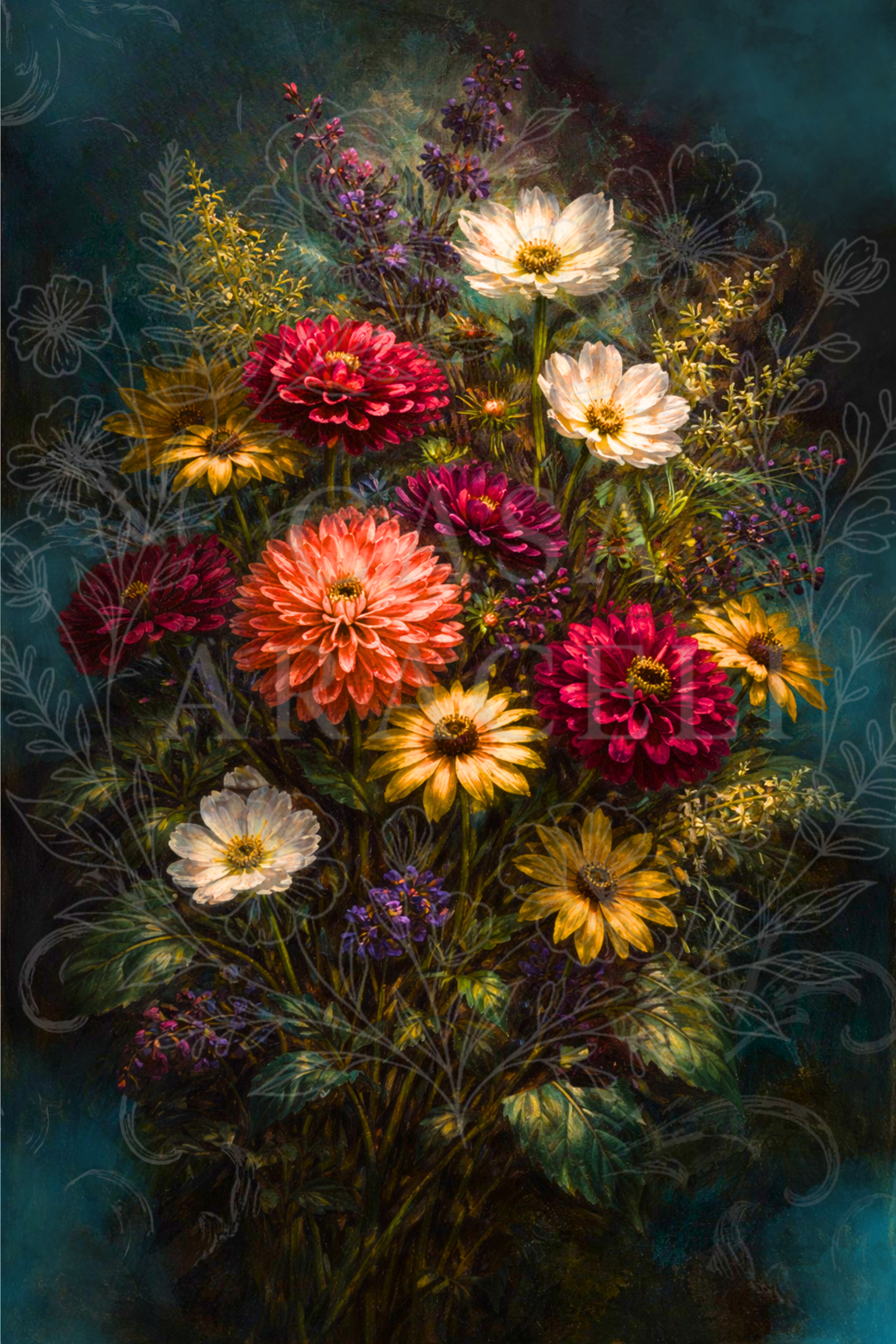 Inspired by the dramatic shadow of old European still life paintings, but rooted in native North American garden blooms, Velvet Blooms brings New World florals (Black-eye Susan’s, Zinnias and Cosmos) into an Old World atmosphere. The richness isn’t ornamental — it’s grounded. Color rises from shadow with intention, giving the piece a quiet depth that feels collected rather than styled